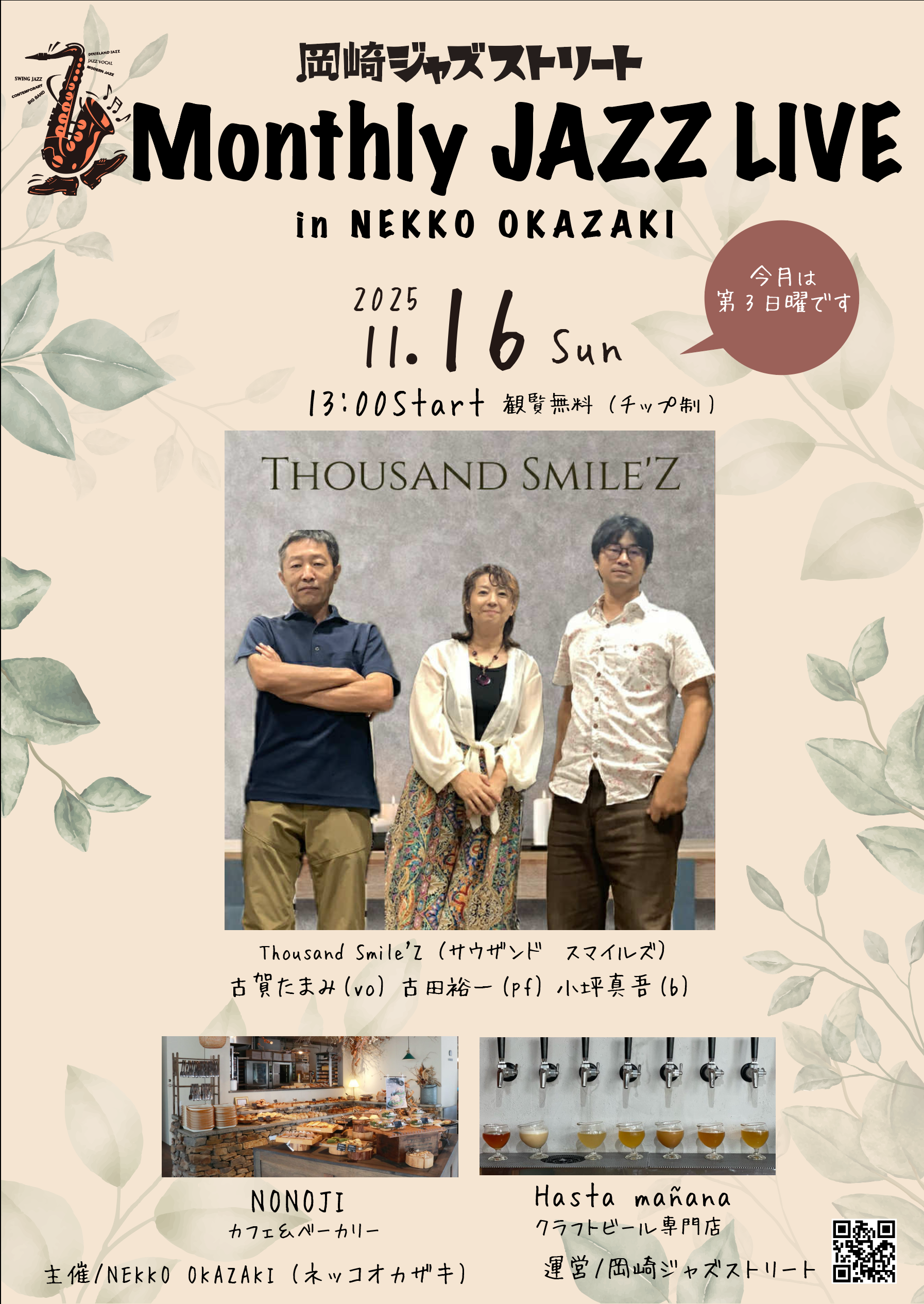 【11月16日(日)開催】NEKKO岡崎・マンスリージャズライブへお越し下さい!