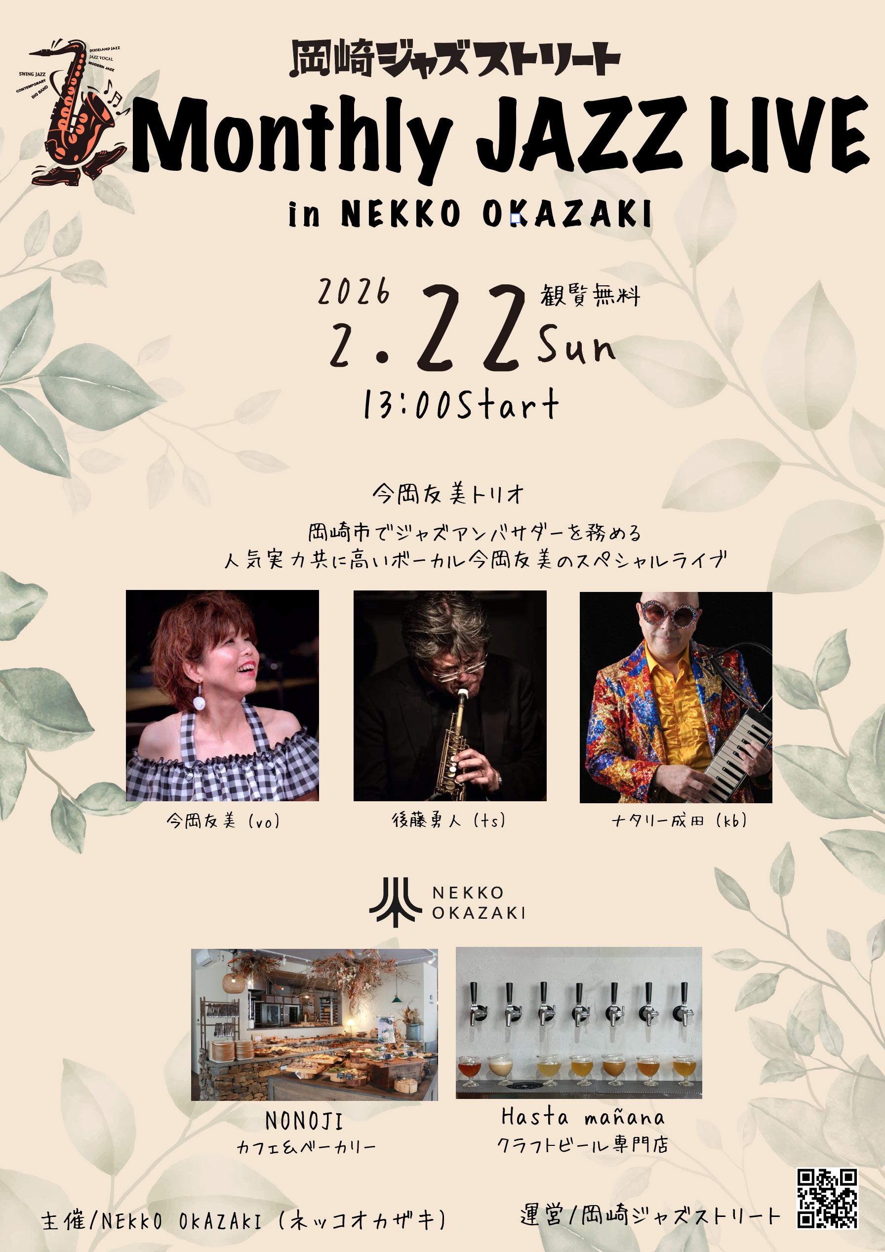 NEKKO岡崎では毎月第4日曜にジャズライブを開催しています。