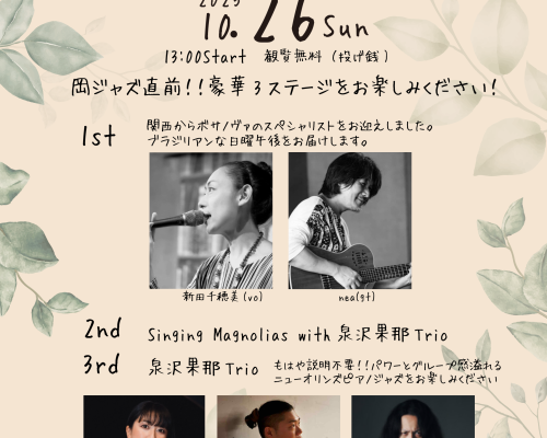 NEKKO岡崎では毎月第4日曜にジャズライブを行っています。 10月は岡ジャズ直前スペシャル!豪華3ステージをお楽しみください。 1st 新田千穗美(vo)nea (gt) 関西からボサノヴァのスペシャリストをお迎えし […]